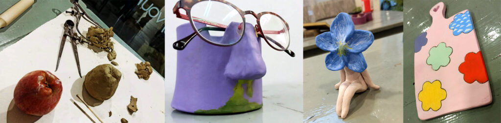 Ο φυσικός πηλός είναι ένα εύπλαστο γήινο υλικό. Ο τρόπος που το δουλεύουμε θέτει σε κίνηση ολόκληρο το σώμα. Κατά τη διάρκεια του μαθήματος δημιουργούμε, ως επί το πλείστον, ολόγλυφες φόρμες. Δουλεύουμε από παρατήρηση αλλά και ελεύθερα με σκοπό την εκμάθηση, την αισθητική καλλιέργεια, την απελευθέρωση της φαντασίας. Με τα δάκτυλα μας και με τη βοήθεια εργαλείων επεξεργαζόμαστε τον πηλό, μέχρι να επιτύχουμε την επιθυμητή μορφή. Αφού εξοικειωθούμε με το υλικό και την διαδικασία, μπορούμε να δημιουργήσουμε τα δικά μας γλυπτά από το μηδέν.