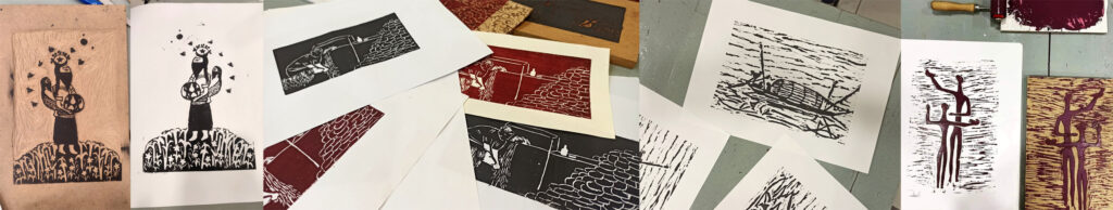Στο εργαστήριό μας διδάσκεται η τεχνική της ξυλογραφίας. Βλέπουμε έργα καλλιτεχνών και δοκιμάζουμε τα εργαλεία χάραξης σε ένα πρόχειρο ξύλο ώστε να κατανοήσουμε τις δυνατότητες και τους περιορισμούς της τεχνικής αυτής. Φτιάχνουμε το σχέδιο μας σε χαρτί το οποίο έπειτα μεταφέρουμε στο ξύλο μας. Μετά κάνουμε τη χάραξη στο ξύλο, τη μήτρα όπως αποκαλείται, και τέλος τυπώνουμε το έργο μας στο χαρτί. Το πιο σύνηθες είναι να τυπώνεται το έργο με μαύρο μελάνι σε άσπρο χαρτί. Εμείς όμως δεν βρίσκουμε το λόγο να μείνουμε εκεί και έτσι ενθαρρύνουμε τον πειραματισμό τυπώνοντας με μελάνια σε διάφορα χρώματα και επιφάνειες.